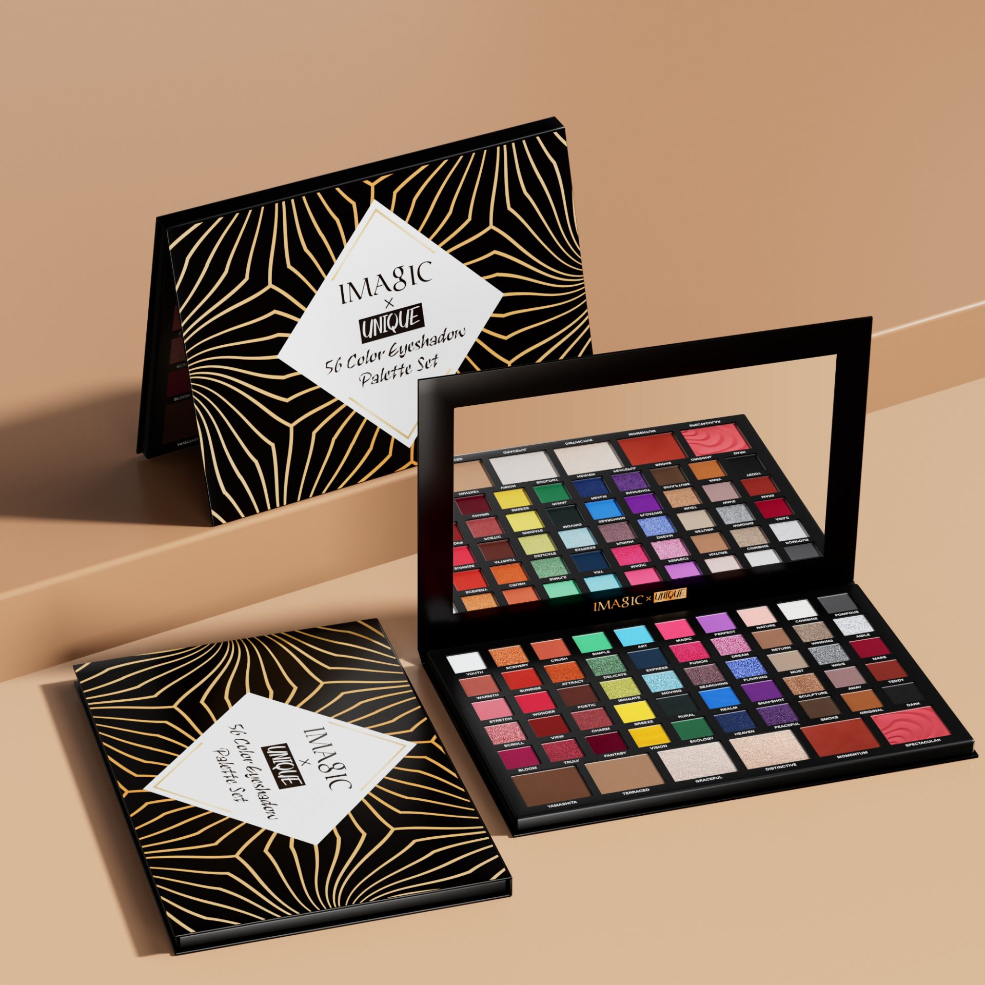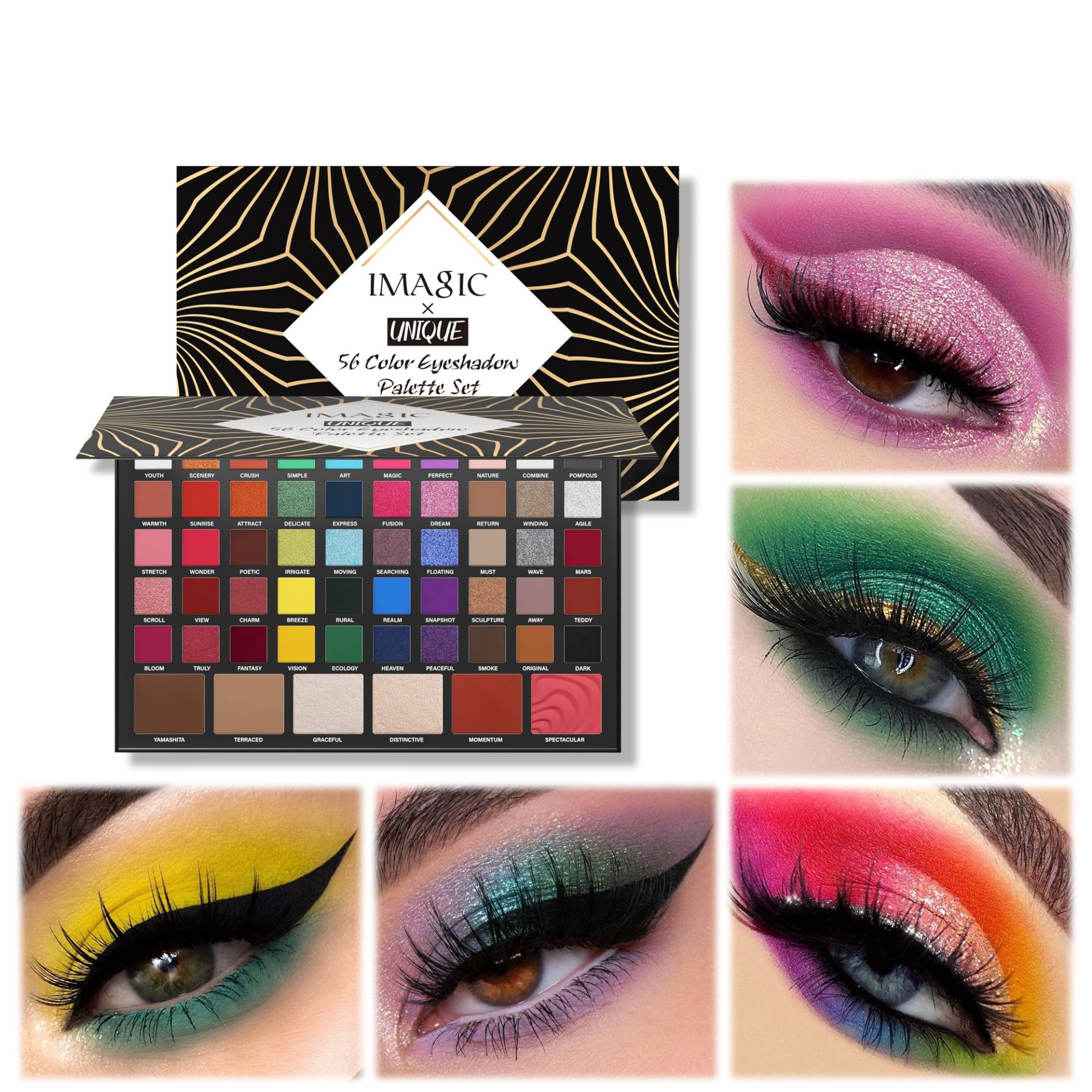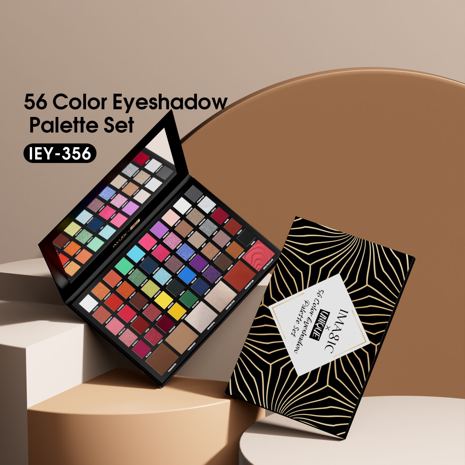 It’s a 56-color multifunctional makeup palette, with fifty-color eyeshadow, two-color blush, two-color highlighter, two-color contour. You can finish the whole face makeup with one palette!