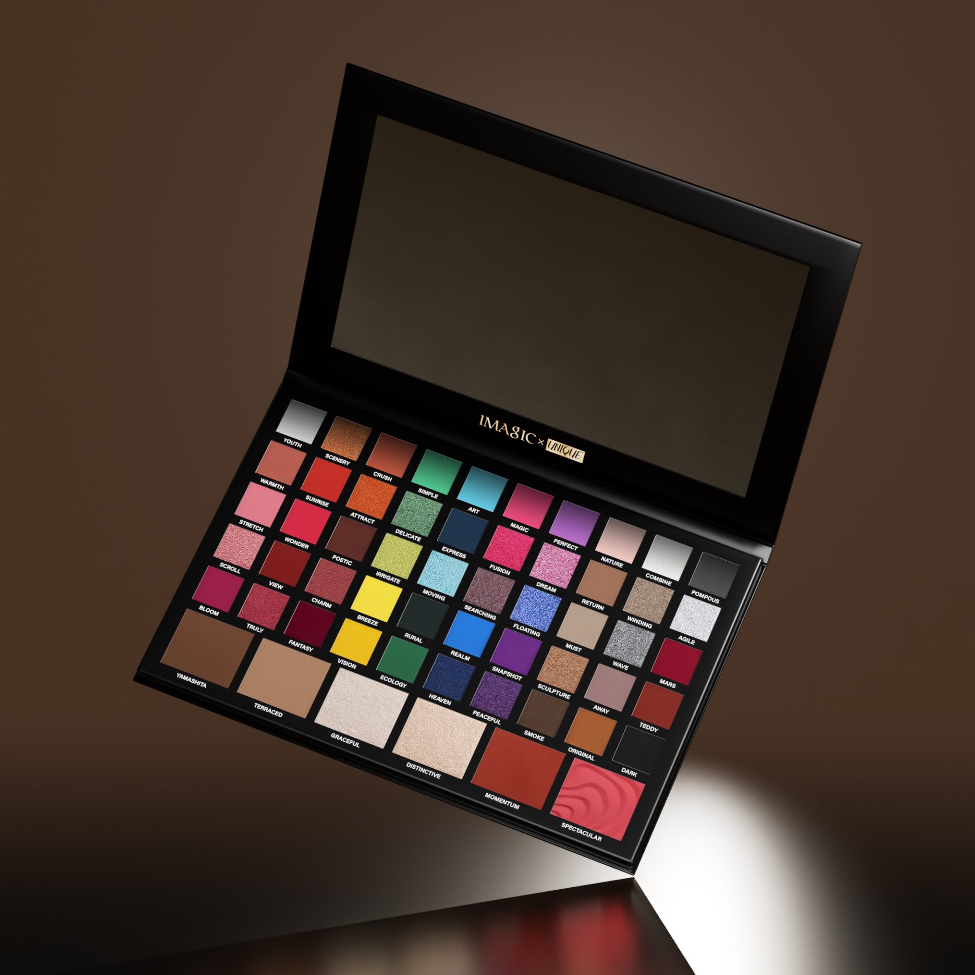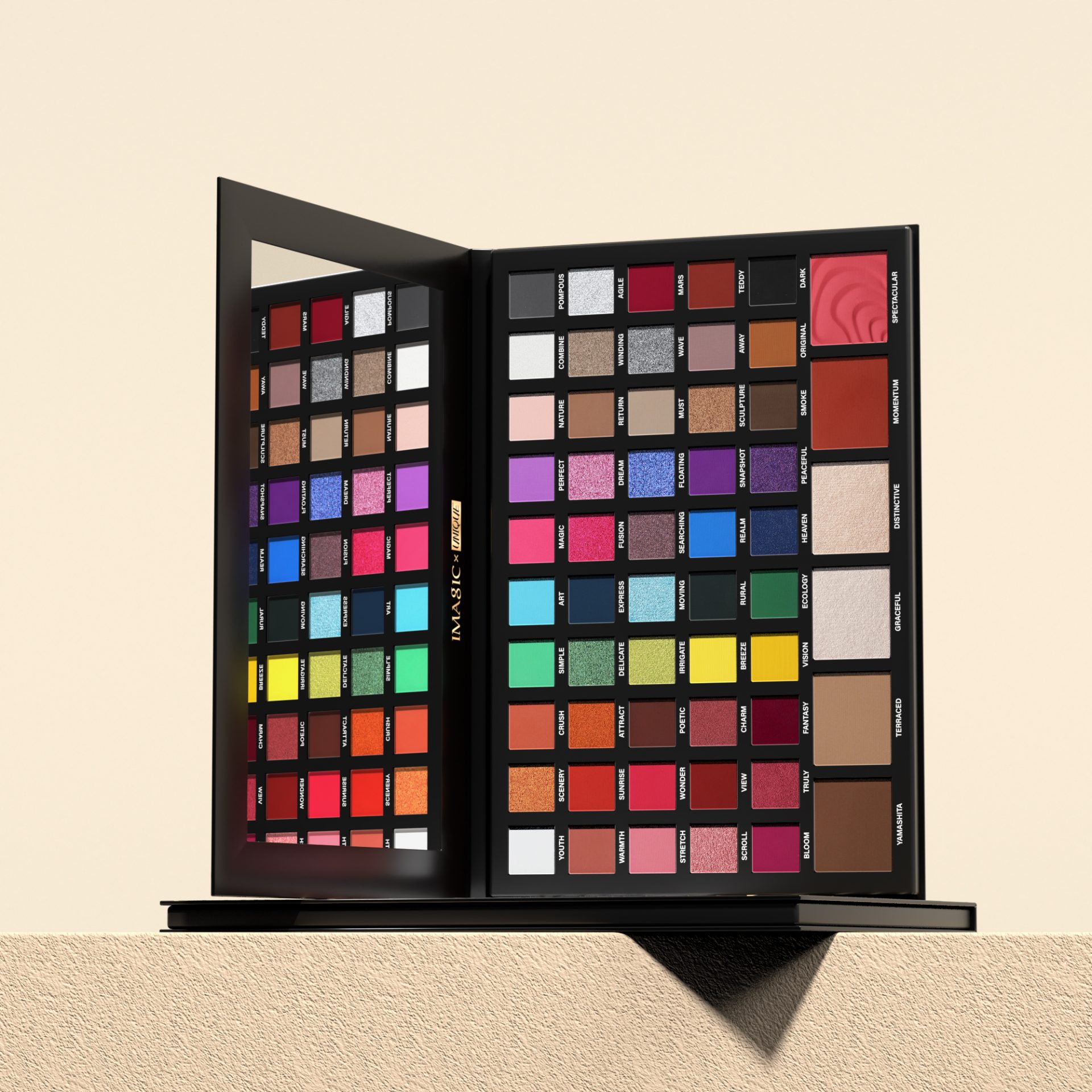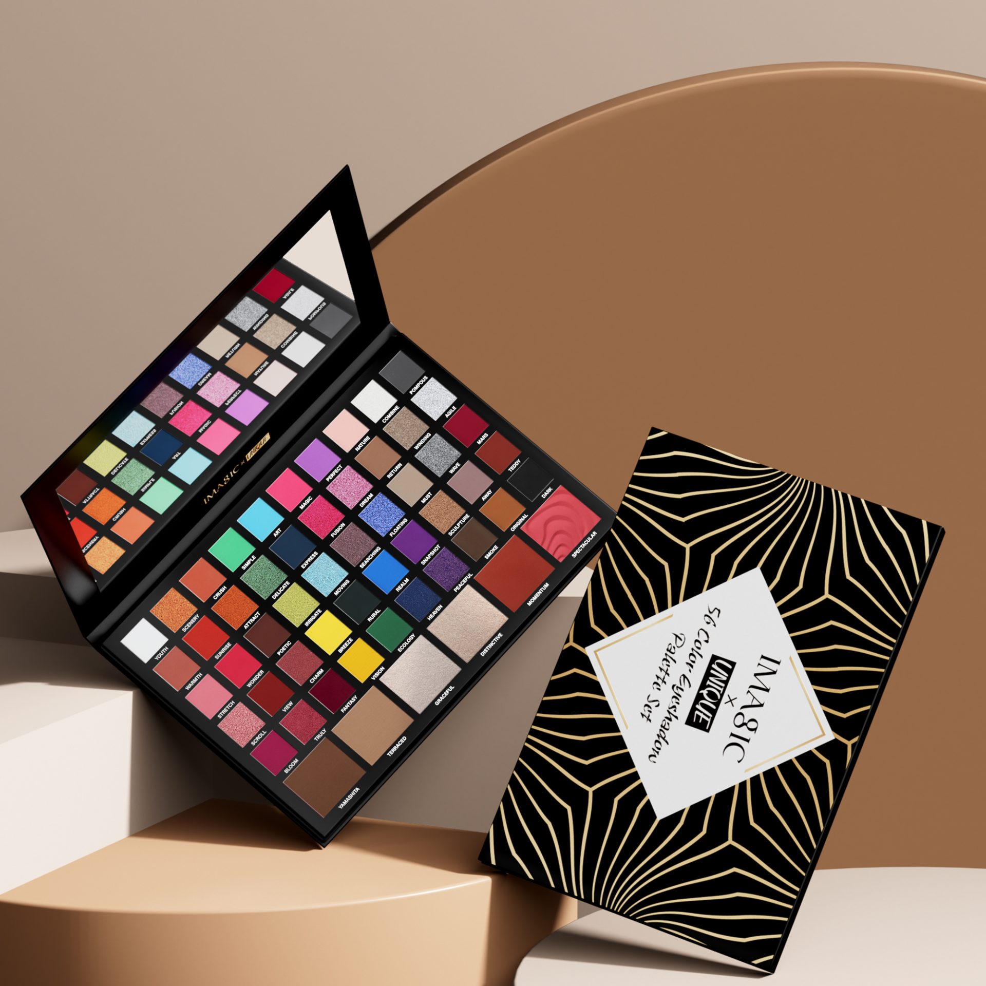 It’s a 56-color multifunctional makeup palette, with fifty-color eyeshadow, two-color blush, two-color highlighter, two-color contour. You can finish the whole face makeup with one palette!